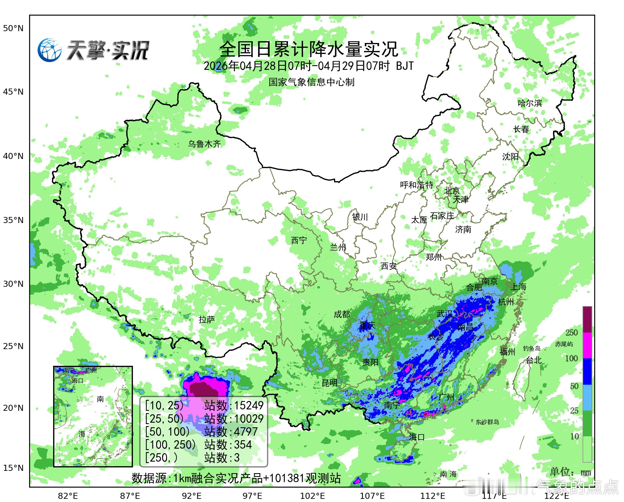 气象观察团 昨天至今晨,安徽中南部、江苏西南部、浙江西部、湖北东部、江西大部、湖南东部和西南部、广东中西部、广西及重庆西南部、贵州东北部等地部分地区出现大到暴雨,其中安徽南部、江西北部、湖南东南部、广东西南部和北部、广西东部等局地大暴雨,广东阳江局地特大暴雨;上述部分地区最大小时降雨量40~80毫米,广东阳江和江门局地100~118.7毫米。江西九江濂溪区、广西百色田东县等地日雨量突破月极值。暴雨强对流