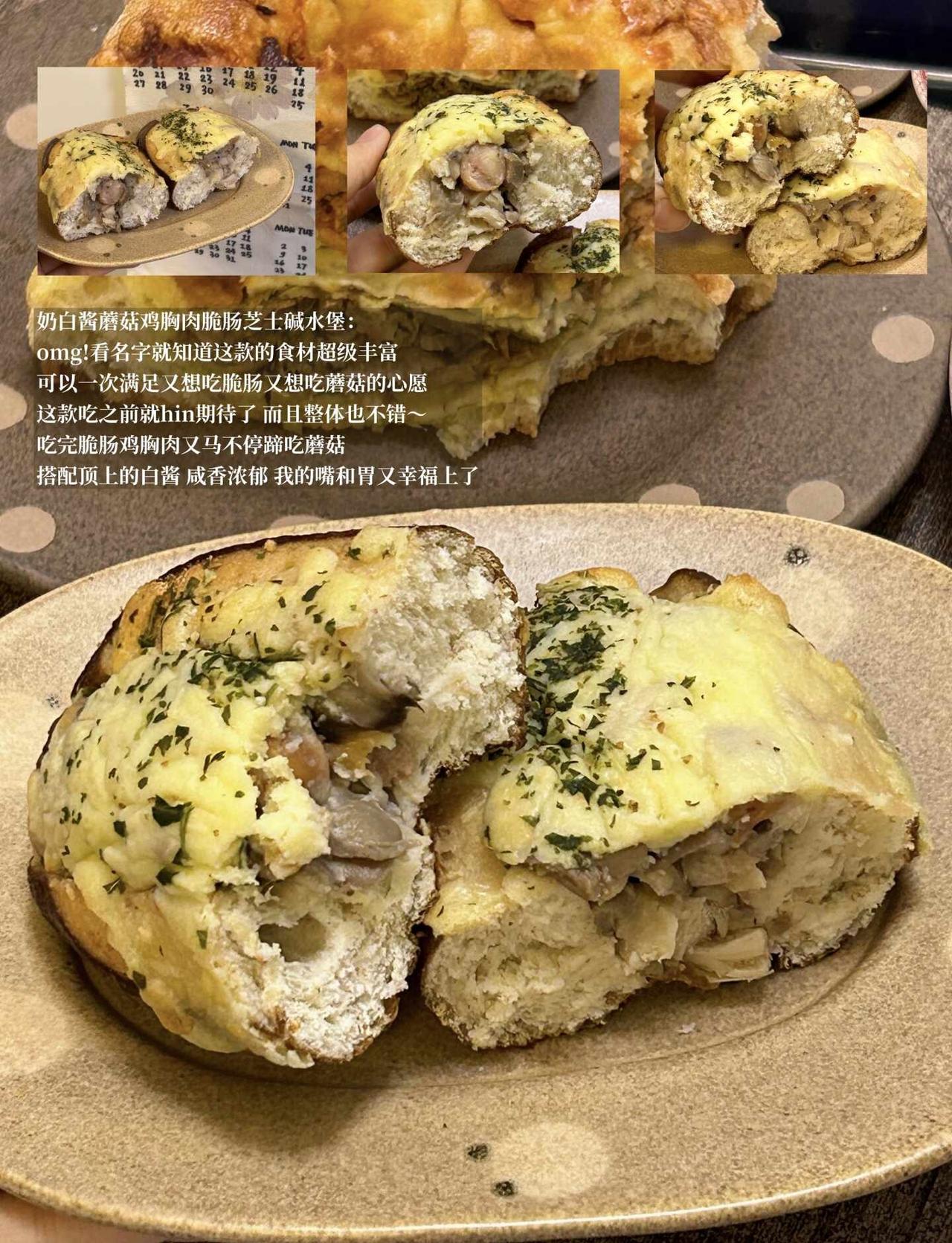 ·奶白酱蘑菇鸡胸肉肠芝士碱水堡