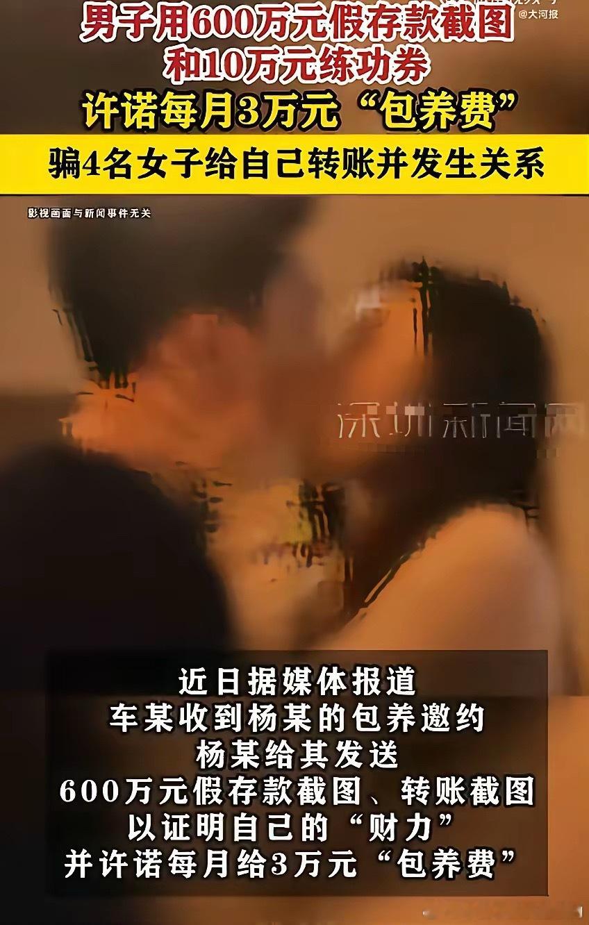 男子许诺3万包养费骗4人发生「关系」,一捆成本不到10块钱的练功券,他硬是骗了4个姑娘连「色」带「财」!上海一男子冒充房产大亨,用“押金”“买包”假转账截图精准猎「艳」,两个月内多人失「身」又失「财」说实话,今天在手机上刷到这条新闻,反复看了三遍。不是骗局有多高明,是手段也太低劣了,竟然还有四个姑娘栽了跟头。有个男的,在网上装成在上海干房地产的大老板。看见哪个姑娘发日常视频,上去就甩一张600万元的银行截图,张嘴就是:每月给你3万,让我包养你。为了让姑娘信,他上来的攻势那是一套一套的。先要你的银行卡号,说先转3万定金,跟着发来一张假转账截图,骗你说设了24小时到账。紧接着,又说给你买了名牌包,再扔来一张假订单截图。最绝的一招在后头。他掏出一捆用胶带缠得死死的十万块现金,直接塞你手里,跟你说:这钱押在你这里,我这诚意够足了吧?但是你可千万别拆,明天我还来取。咱平心而论,谁手里攥着这么一捆沉甸甸的钞票,心里不打鼓?防线瞬间就垮了。等到生米煮成熟饭,他的套路就来了。马上装可怜,说助理在外面急用钱,自己卡里钱暂时转不出,让你赶紧垫个两千三。转完账,他拿起衣服就溜。第二天姑娘心里发毛,把那捆钱拆开一看,天都塌了——里面全是银行员工练点钞的练功券。这玩意儿网上几块钱一沓,这捆成本还不到十块钱。就靠这价值不到20块钱的道具,他真就在短短两个月里骗了4个姑娘,连色带财全骗走了。好在法律没放过他,奉贤法院最后判了他七个月有期徒刑。这事光靠警察抓、法院判还不够,咱自个儿也得把心里的秤摆正了。那捆让姑娘跌进去的十万块,戳破的全是人性的贪念。别管是网上的富豪,还是现实里的大款,突然有人拿巨款砸你头上,但凡多在心里转个弯,他们就得翻车。回家跟自家闺女、侄女,或者身边单身的姐妹都念叨念叨。凡是网上认识、没见几次面就敢把巨额现金封死让你保管的,有一个算一个,全是骗子。天上掉下来的,不是馅饼,全是铁饼。看完了别忘了转给家里人,评论区说说你们见过的奇葩骗局,也算给大伙儿提个醒。