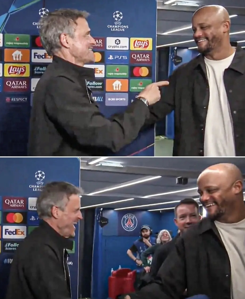 恩里克在赛后和孔帕尼打招呼时,问孔帕尼,你是在看台上看的比赛是吧?得到肯定的回答后,恩里克继续问你喜欢(这样看比赛)吗?孔帕尼回答,当然不喜欢。