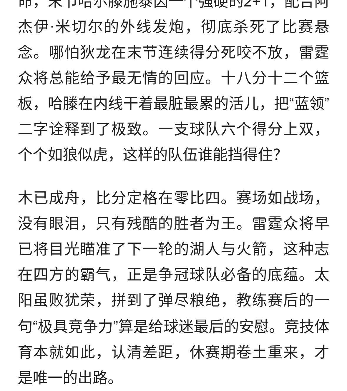 看到这份季后赛预测,脑袋先短路了。西部:雷霆4-0太阳;湖人4-1火...