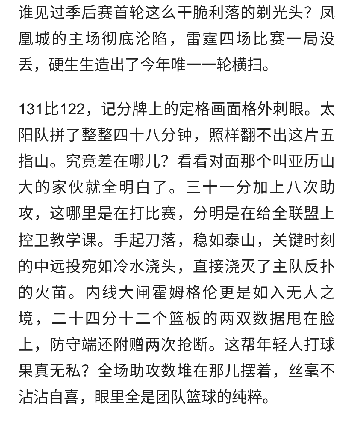 雷霆4-0横扫太阳!亚历山大31分率队下克上