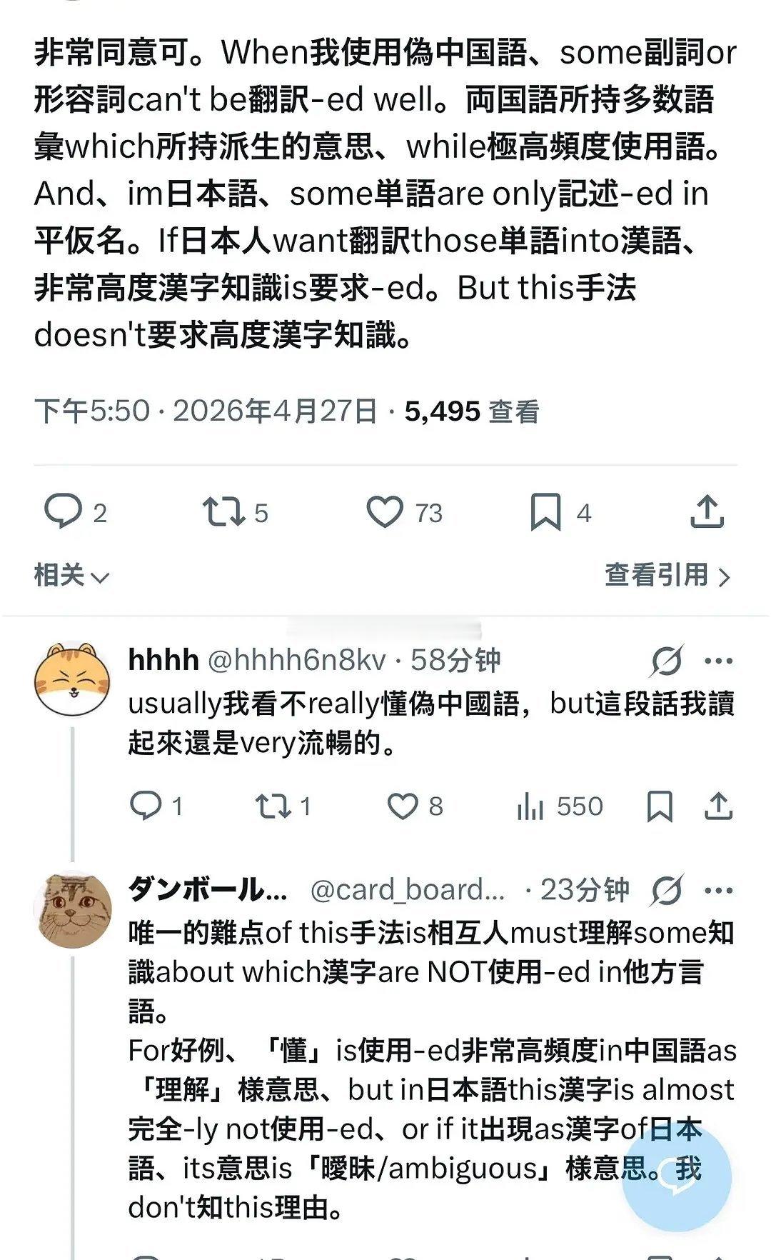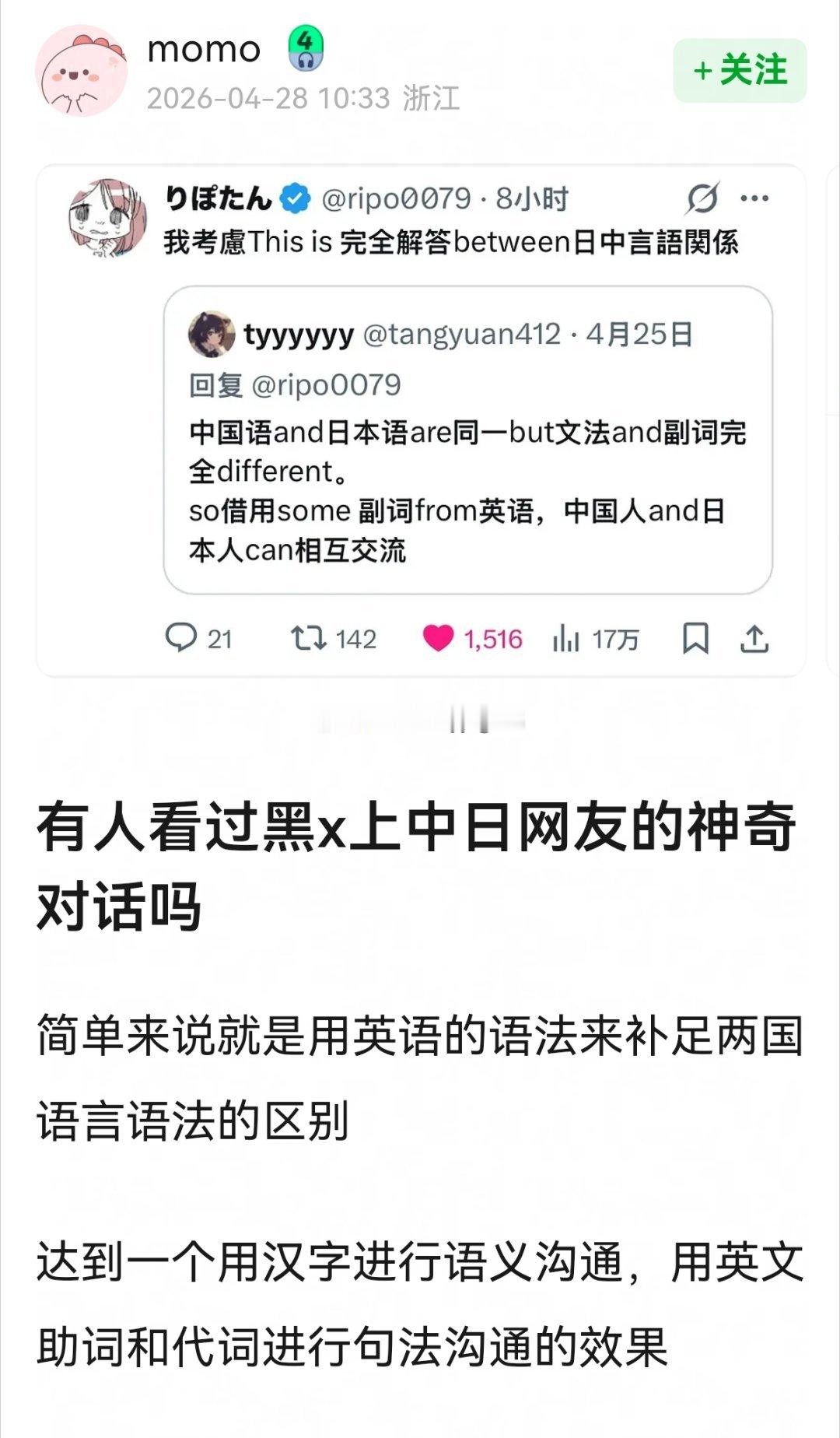 有人看过黑x上中日网友的神奇对话吗?简单来说就是用英语的语法来补足两国语言语法的