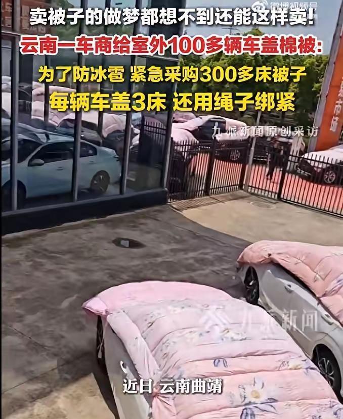 这才叫有“被”无患!云南曲靖,一家销售汽车的经销商连夜采购 400 条棉被,本以为是给员工发福利,没想到是拿回去盖新车,网友调侃:云南十九怪,汽车盖被卖!