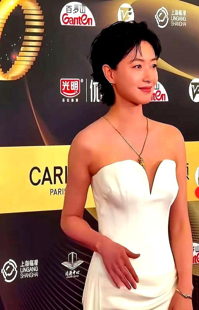 最近风格又变了。2026年换上微卷短发,西装配半裙,一下就温柔干练起来。年初活动那身黑色缎面长裙,那个背部线条,一看就是长期自律的结果。