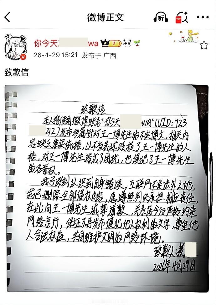 【王一博黑粉写致歉信】曝王一博没见过自己的演艺合同 4月29日,据:2026年4月29日,王一博先生诉赖*(“你今天****wa”,UID:723****212)网络侵权责任纠纷(名誉权)一案,被告赖*遵照生效民事判决书,在涉案微博账号中发布致歉信,向王一博先生公开致歉。
