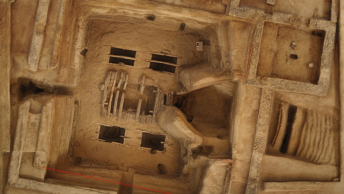 据计算,修这样的大墓需一万人修建一年以上。 目前,考古人员仅发掘了墓葬一、二层,出土了大量陪葬物品和陪葬的马、牛、羊等动物遗骸700余具。在众多的随葬品中,有古代皮靴、古藏文木片、古蒙古族文木牍、彩绘木片及金饰、木碟、木鸟兽、粮食和大量丝绸。