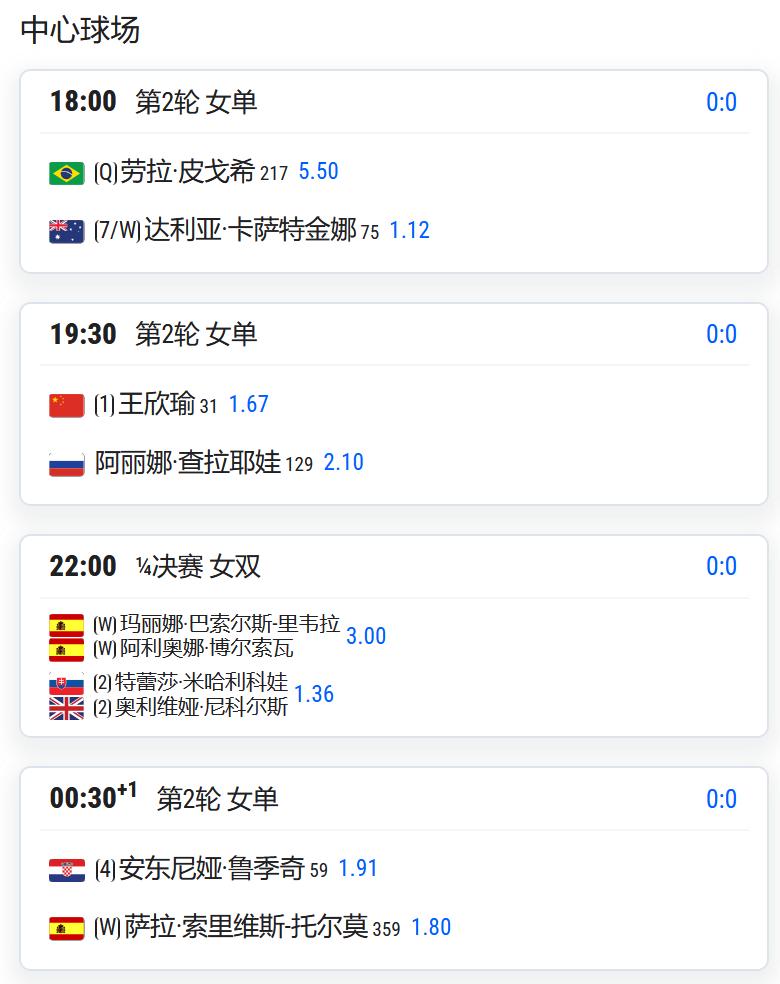 WTA125 拉维斯瓦尔-登波尔达,女单第二轮,王欣瑜将对阵查拉耶娃;