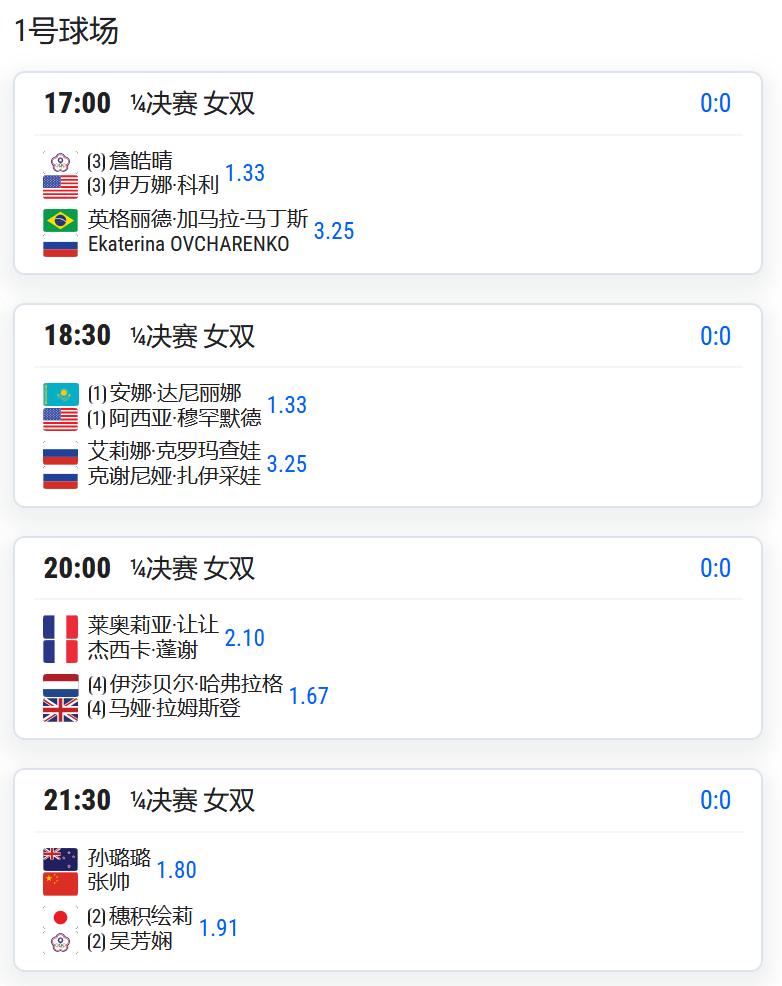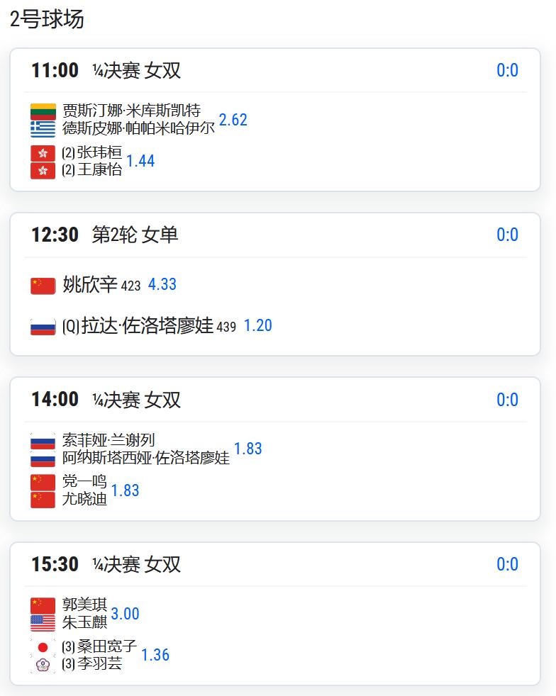党一鸣/尤晓迪将对阵兰谢列/佐洛塔廖娃;