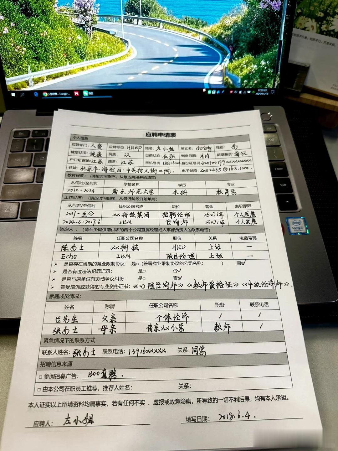 面试当天,女孩准时到达公司,前台给了女孩一张应聘登记表,结果就是这张应聘登记表,让部门做出了pass女孩的决定。原因是女孩在调表的时候,表示这里面很多信息都是涉及到个人隐私的,自己现在不便填写...