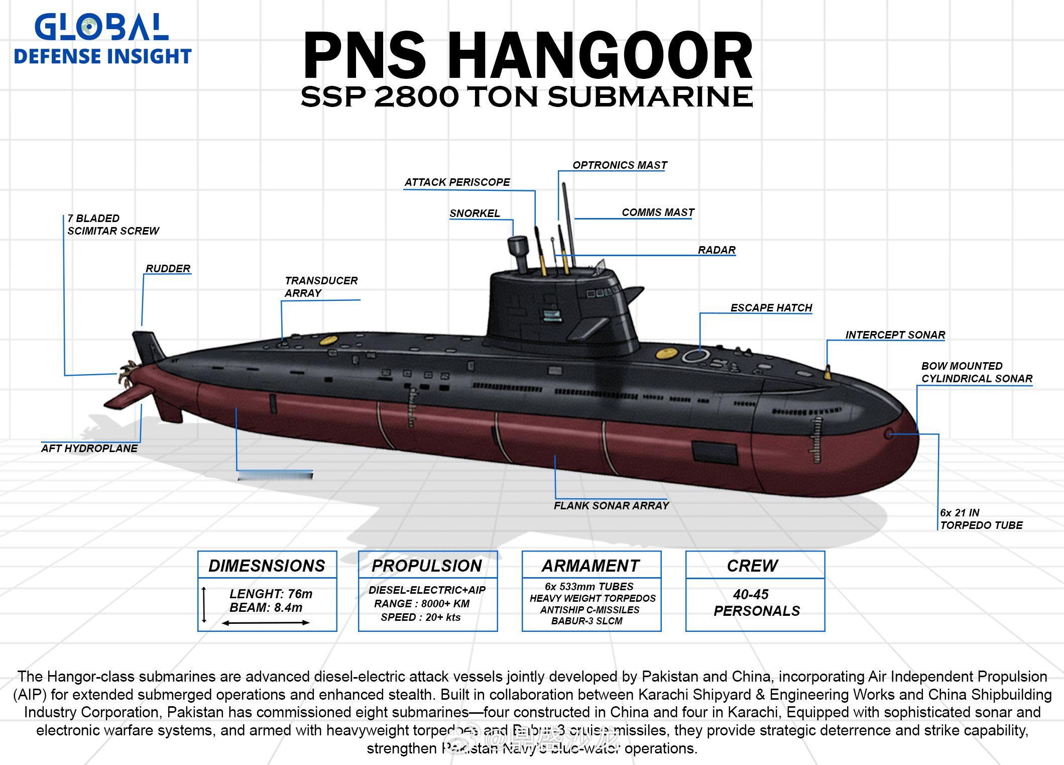 扎尔达里总统称 HANGOR 的服役是巴基斯坦海军现代化的里程碑。纳维德·阿什拉夫海军上将表示,装备了先进传感器、武器和 AIP 的 HANGOR 级潜艇将保障海上通道安全,威慑侵略,维护海上稳定。