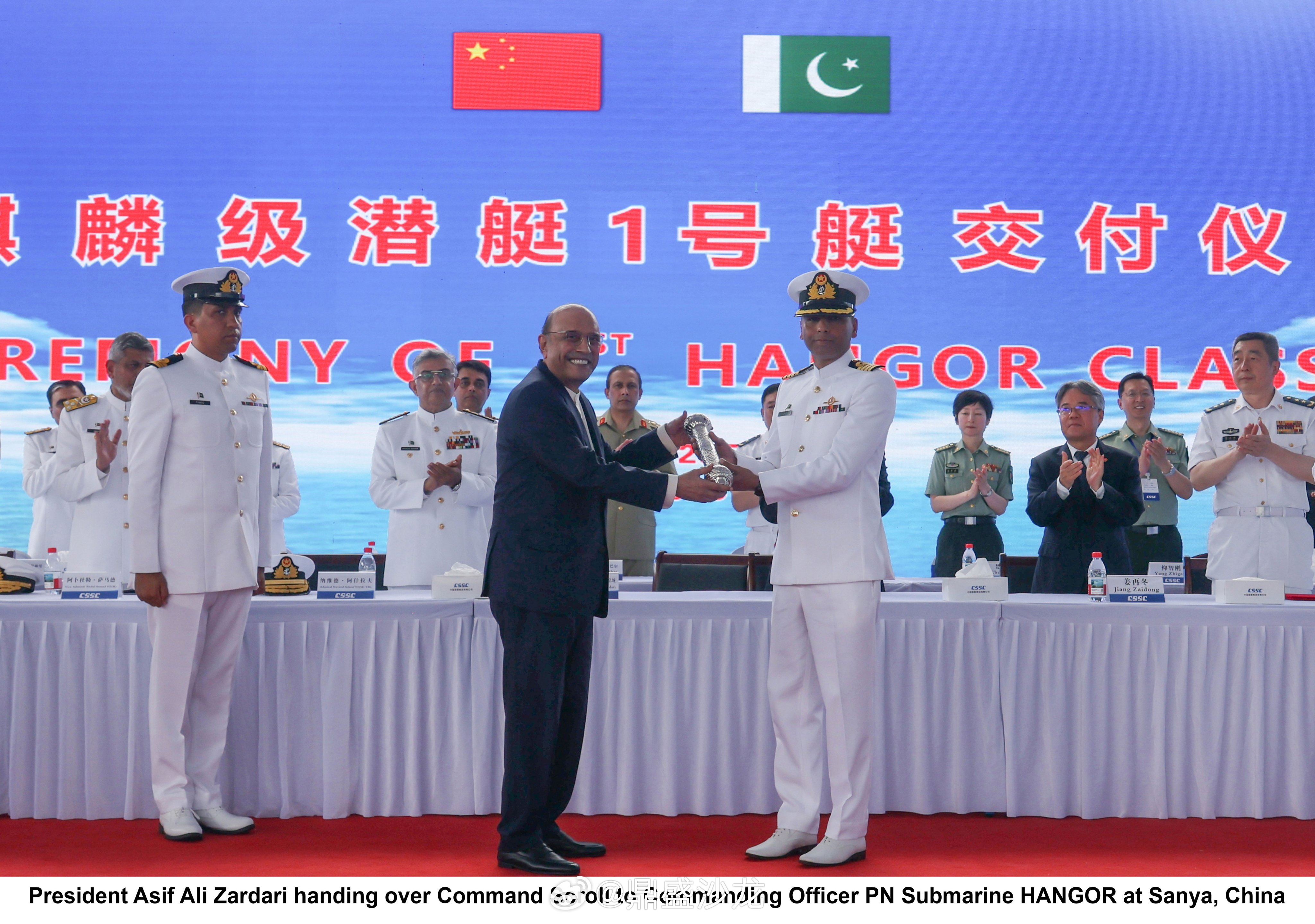 烽火问鼎计划 巴基斯坦海军在中国三亚接收了首艘 HANGOR 级潜艇HANGOR号。巴总统阿西夫·阿里·扎尔达里作为主宾出席了仪式,海军司令阿德姆·纳维德·阿什拉夫也参加了典礼。
