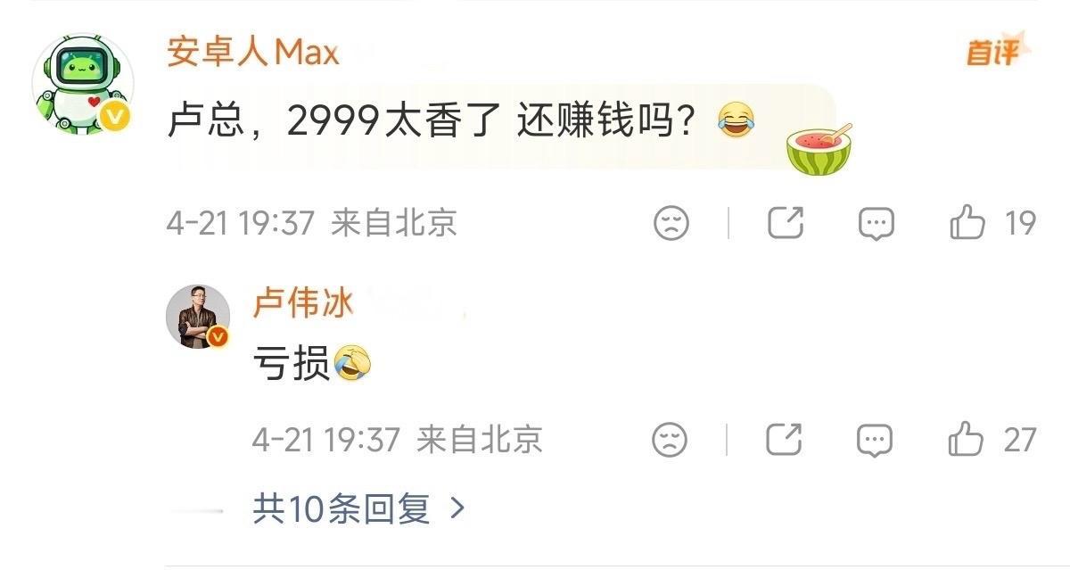 先前刚发售那会儿,有人问卢总卖2999还赚钱吗?卢伟冰直言是亏损的