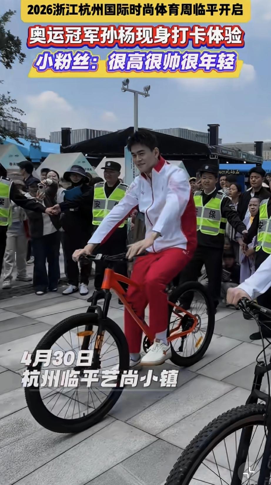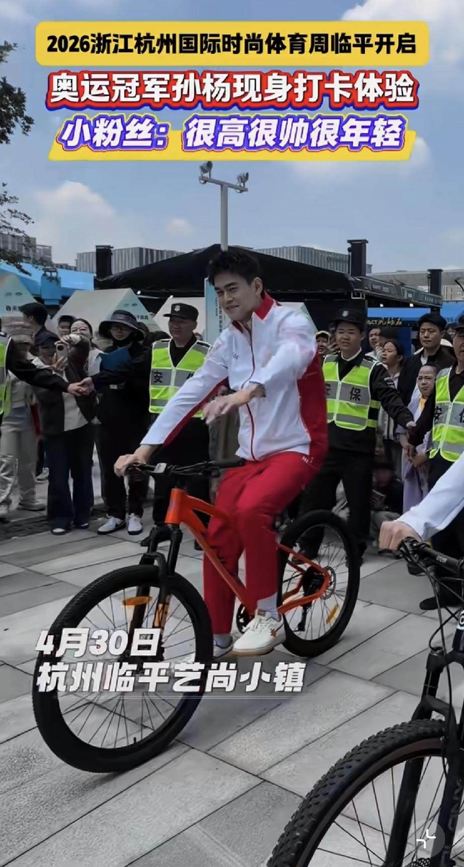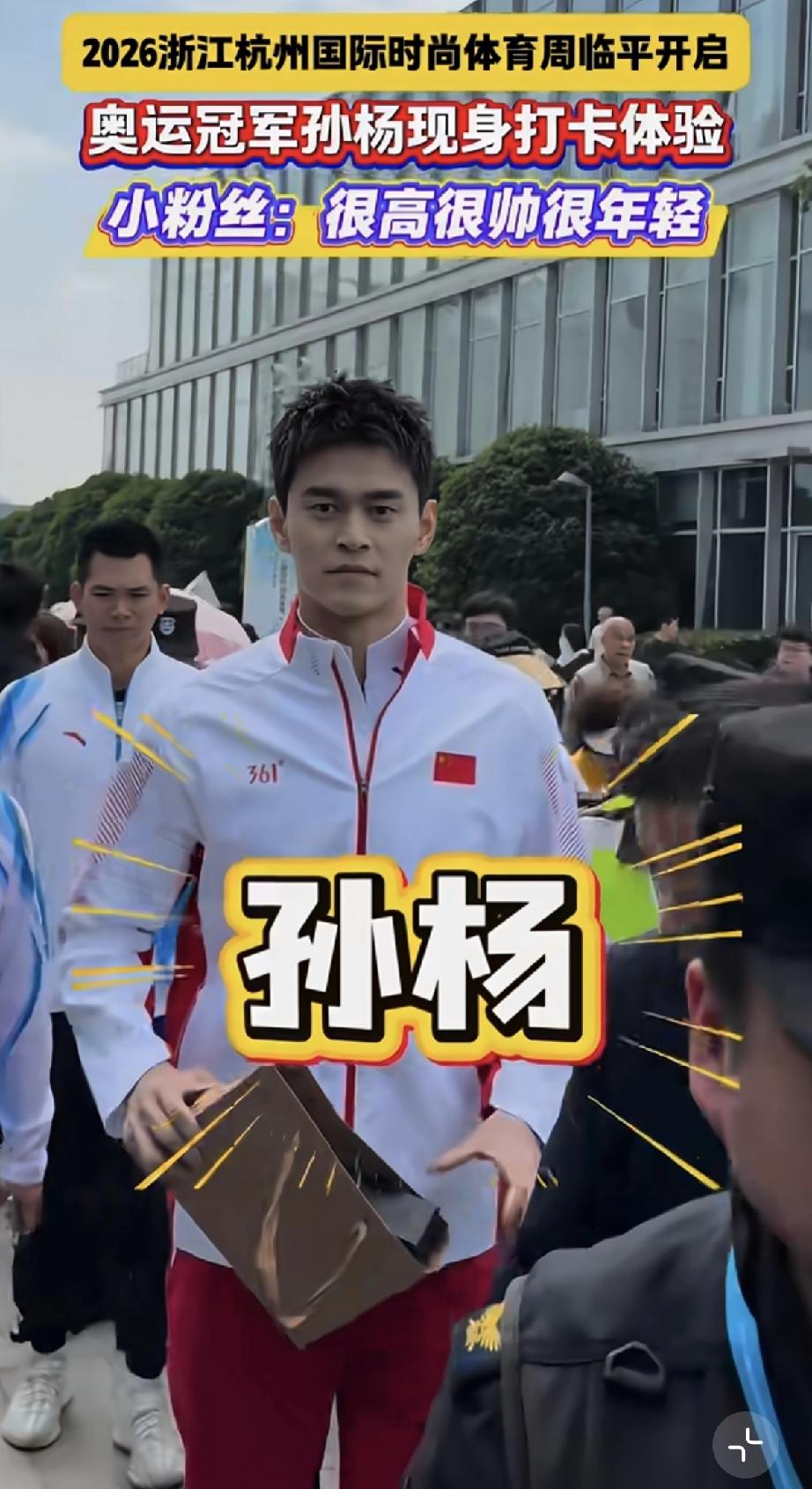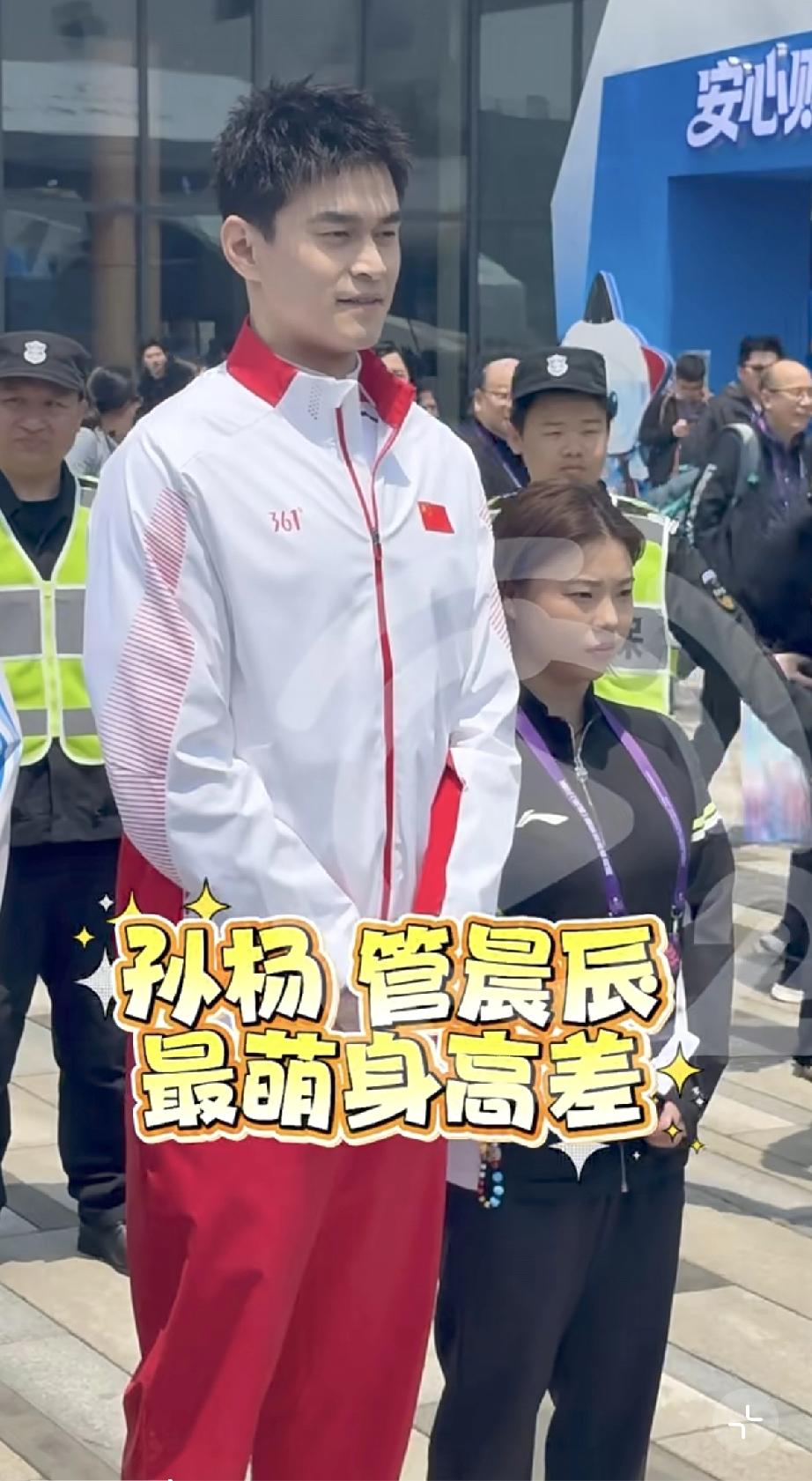 4月30日,孙杨在杭州参加浙江国际时尚体育周,与管晨成身高差太大,而他自己则云淡