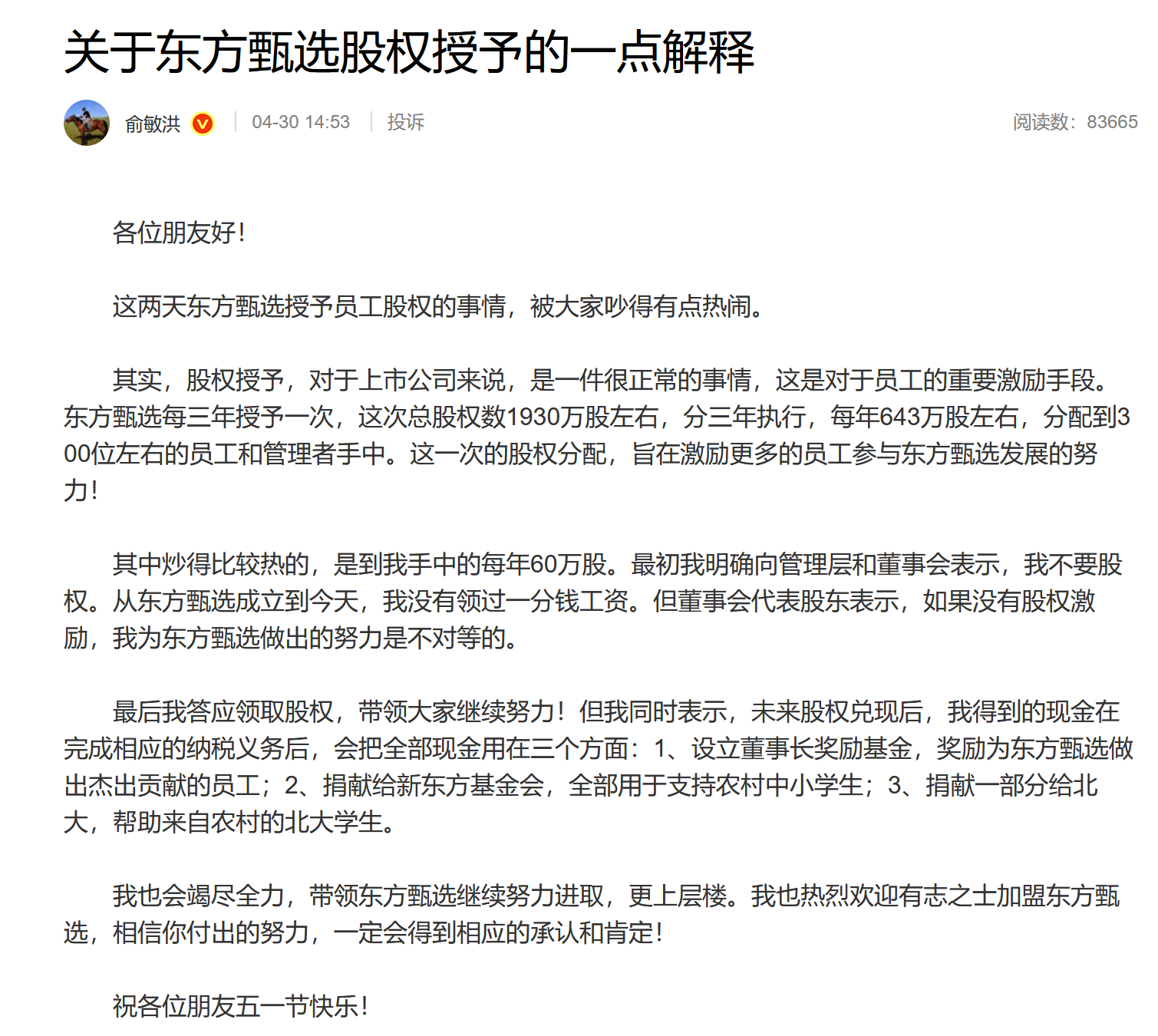 30日,俞敏洪在微博发文解释获得东方甄选股权激励一事,称将全部用于奖励和捐赠。