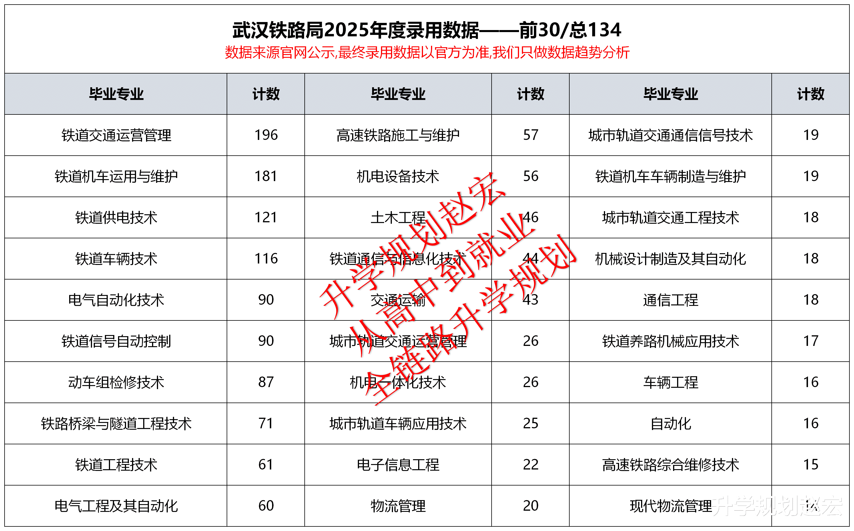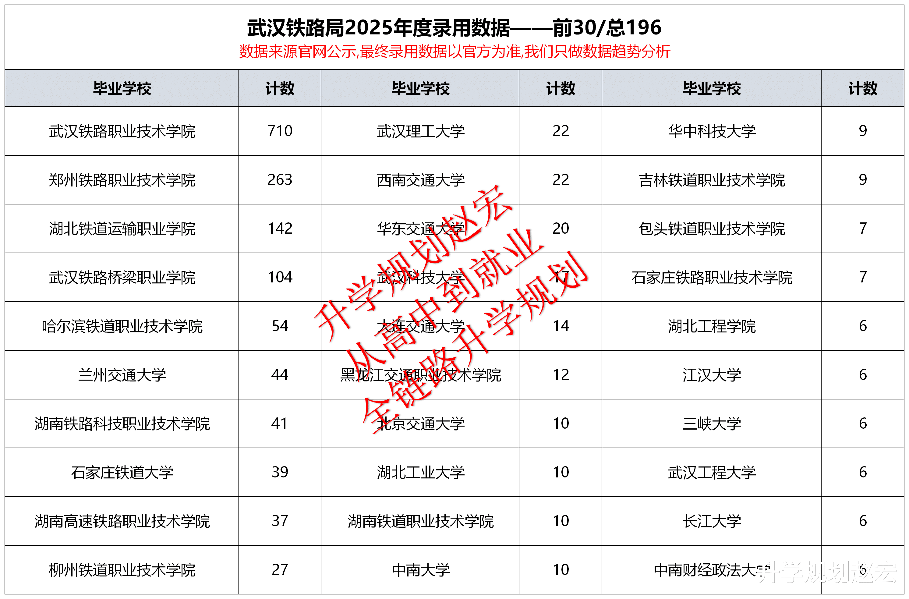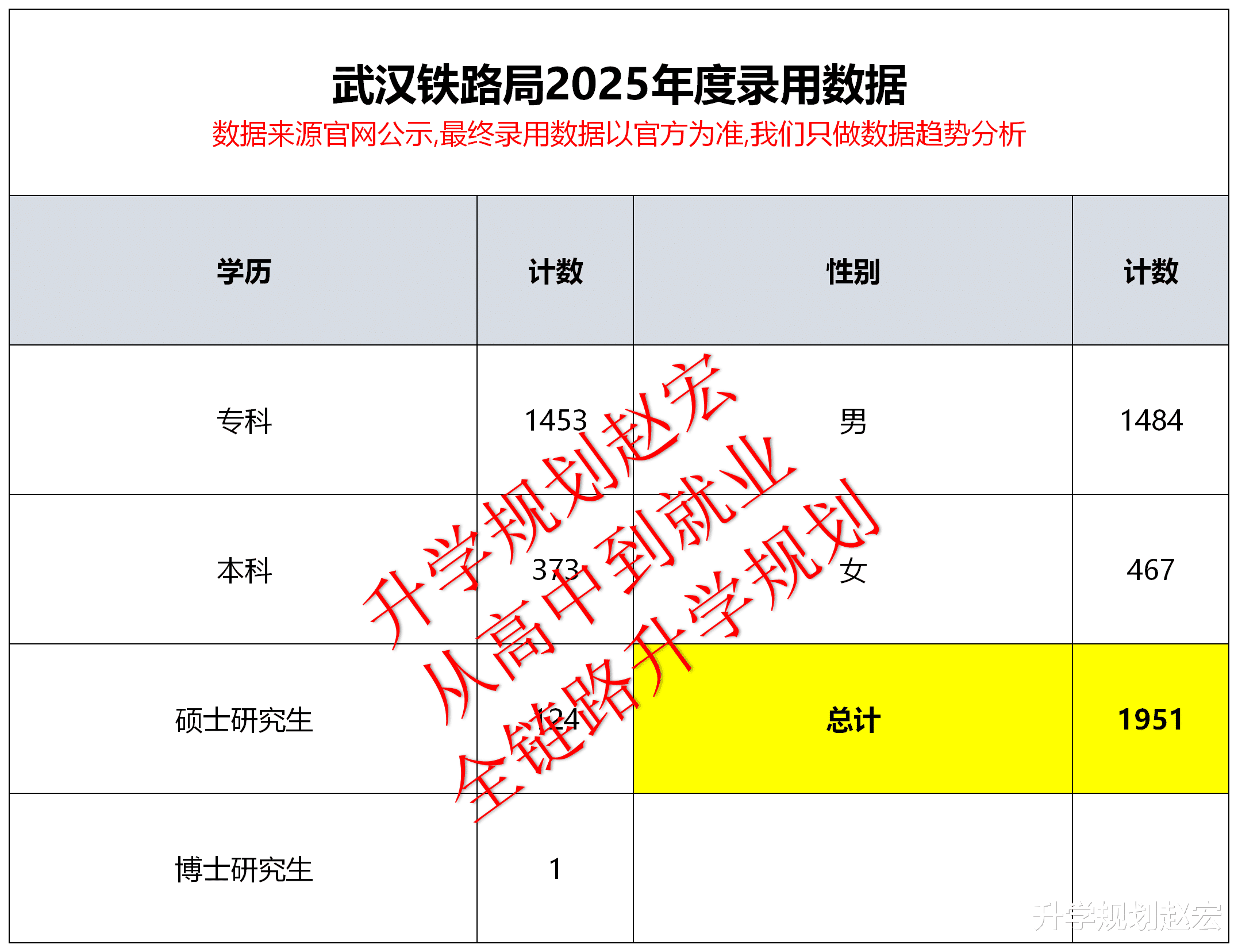 本文咱们来看看武汉铁路局2025年度录取数据,总共1951人,这个人数比2024年要多,大家可以多去对比近几年的数据,然后可以找到规律。另外要注意的是,这些职业技术学院接下来几年会升为职业大学,升级为本科。男生1484人,女生467人。从学历上来看,专科1453人,本科373人,硕士研究生124人,博士研究生1人。接下来本科以上学历的人数也会慢慢变多。往下咱们来看看录用的院校和专业。