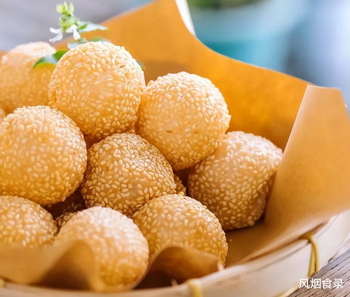 这枚实心金黄球,皮是糯米粉混粘米粉搓揉炸酥,裹满芝麻,咬下去“咔嚓”脆响;