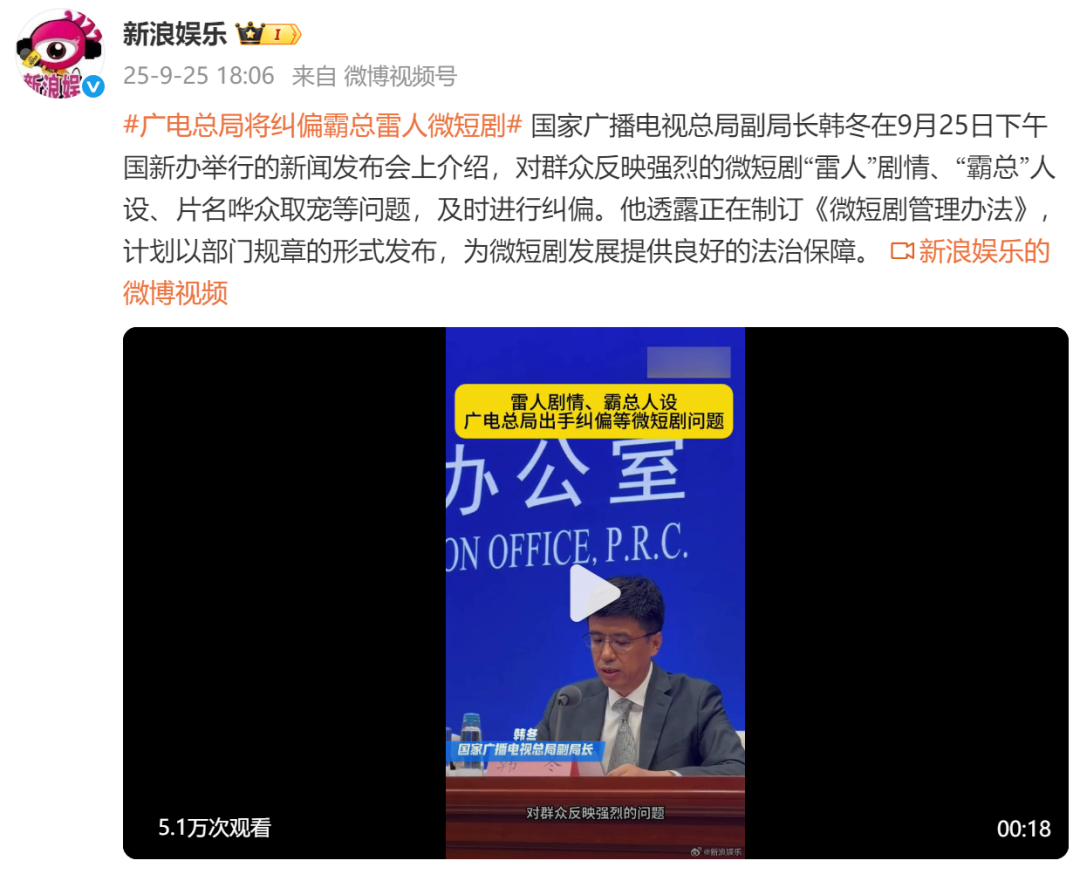 三个月后,“国家广电智库”又在一则推文中透露,广电总局正在谋划出台《微短剧管理办法》,这部行业法规将能更清晰地划清红线、底线,推动微短剧行业避免内卷式竞争。