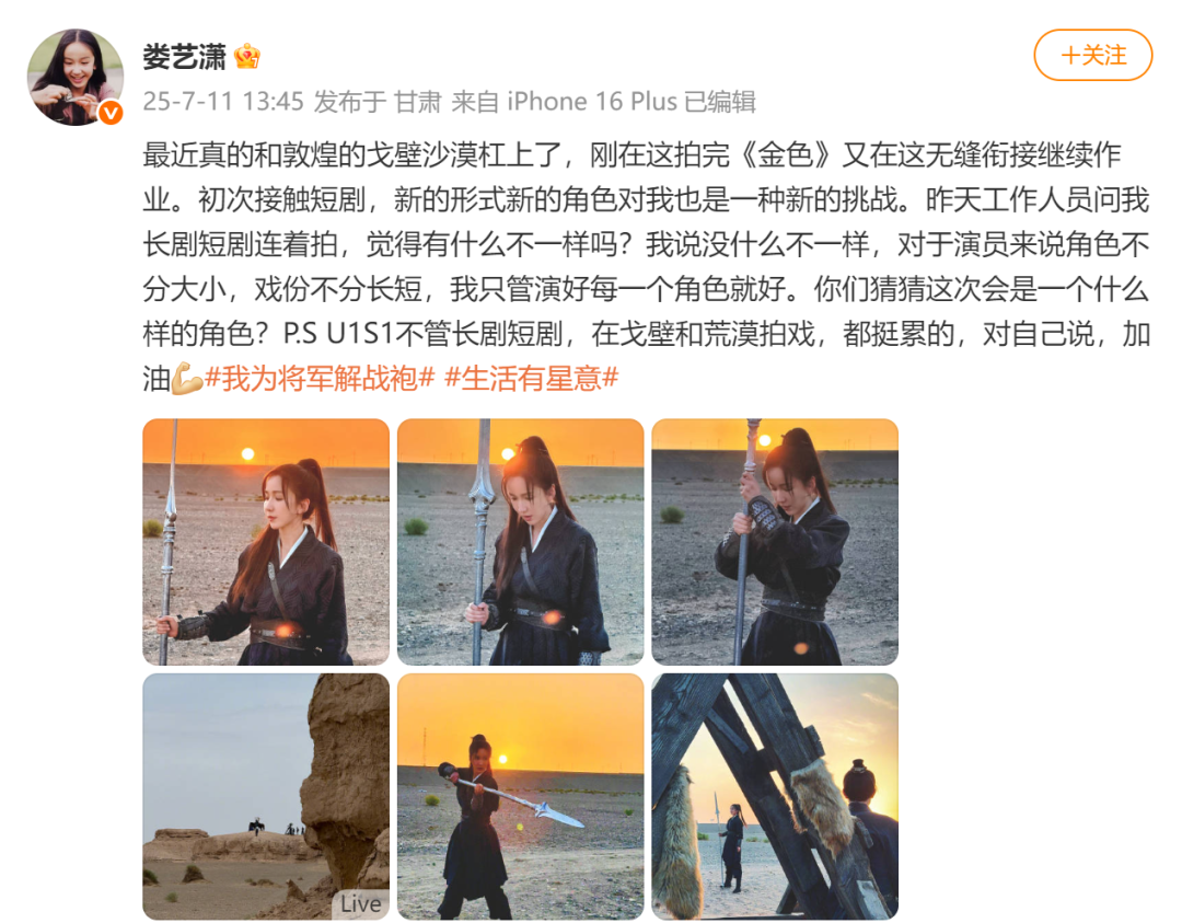也并非接不到长剧出演机会,在进军短剧领域之前,娄艺潇刚结束徐兵导演新剧《金色》的拍摄。