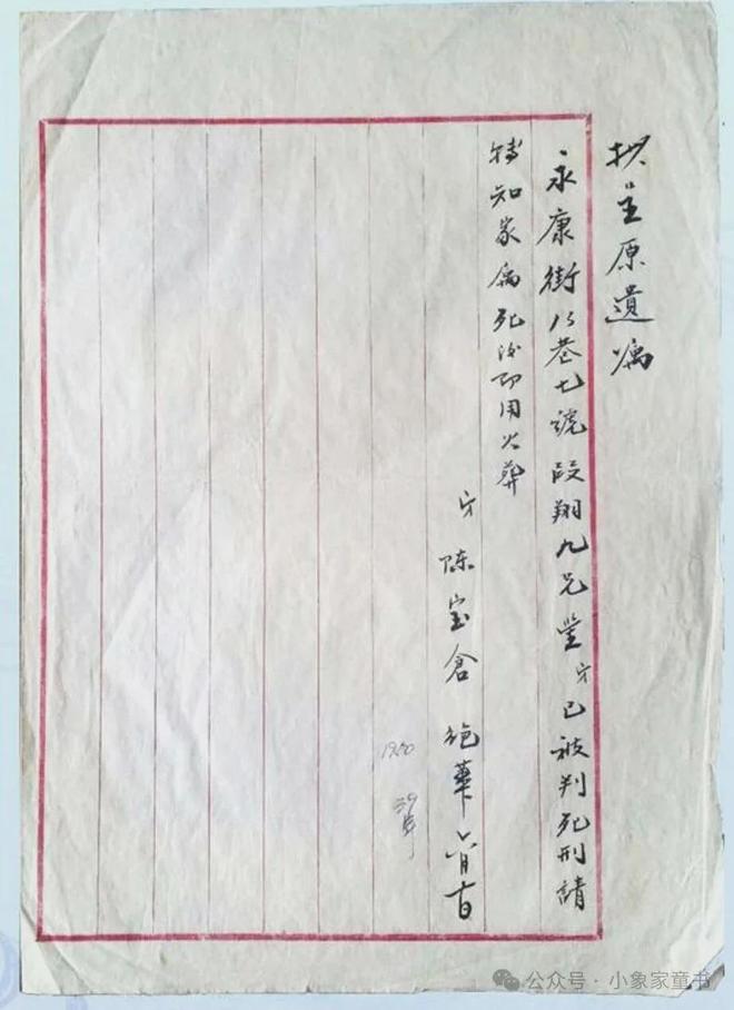 永康街十三巷七号段翔九兄鉴。弟已被判死刑,请转告家属死后即用火葬。