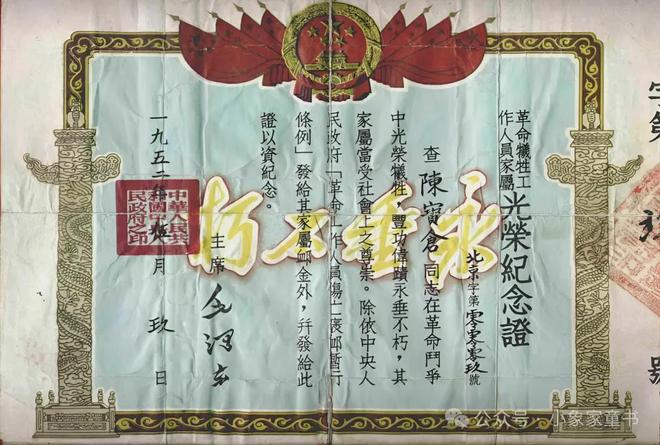 1952年毛主席亲笔签署颁发了第0009号《革命牺牲工作人员家属光荣纪念证》,授予外祖父革命烈士称号。