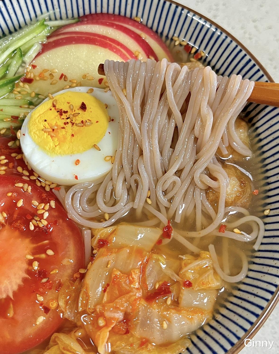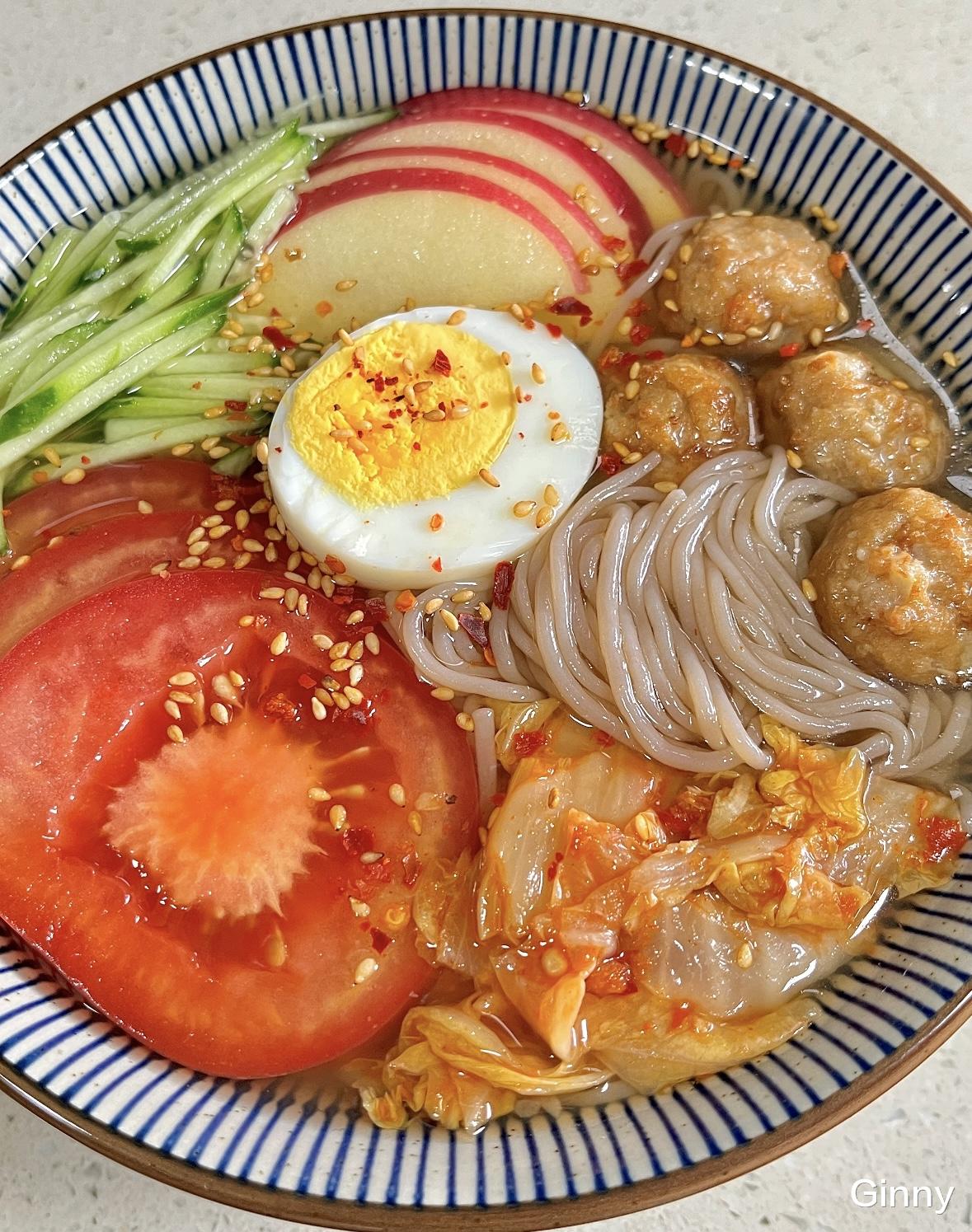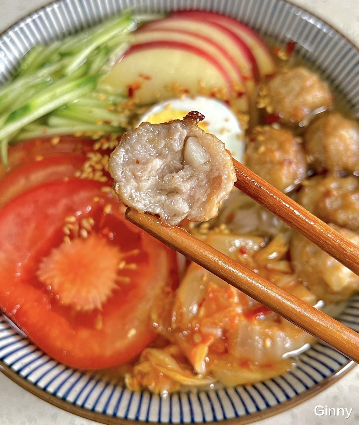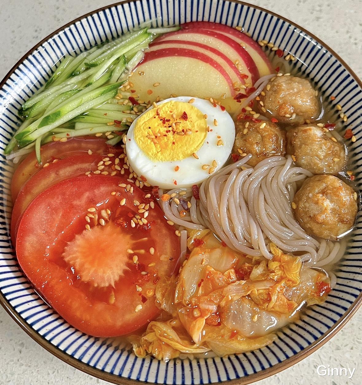 冷面是叮咚定制的延边风味,牛肉汤底浓郁,面条烫1分钟过冰水,筋道得恰到好处。搭配蔡长青猪肉马蹄小肉圆,空气炸锅烤完,外皮微焦,咬开是扎实肉香混着马蹄脆爽,一口超满足~