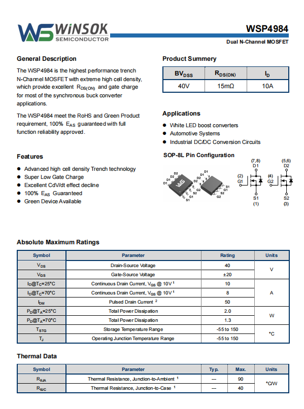 五、结论WSP4984以40 V高耐压、15 mΩ超低导通电阻与13.6 nC超低栅极电荷,为汽车座椅压感腰托提供“双N集成-气动快充-高可靠”方案,实现0.8 s快充、零TVS、低成本。随着智能座椅与主动健康监测普及,WSP4984将在更多气动腰托中持续发挥“快充核”关键作用,助力整车厂打造零压座椅体验。