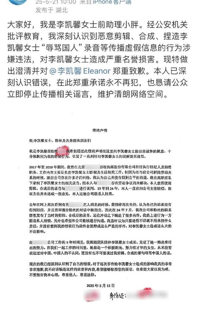 原来在网上发布的“辱华视频”来源于李凯馨的前助理小胖手里,视频发布后,直接将此事推上风口浪尖,如今该前助理小胖,直接在社交平台上进行道歉!