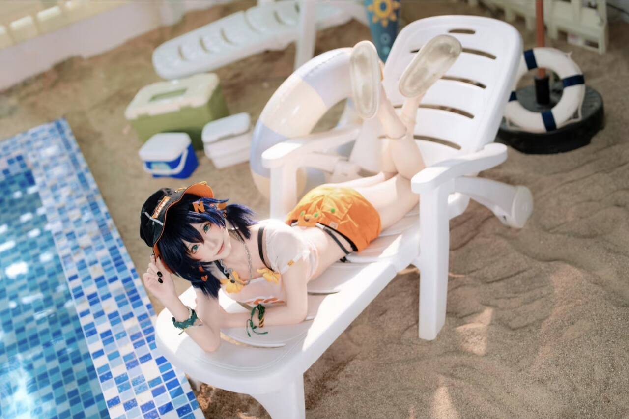 看这组cos,铃戴着有橙色帽檐的黑色帽子,发丝是深邃的蓝,衬得她灵动又俏皮。身上穿着带有“sea”字样的透明白色上衣,搭配亮眼的橙色短裤,满满的夏日活力感扑面而来。