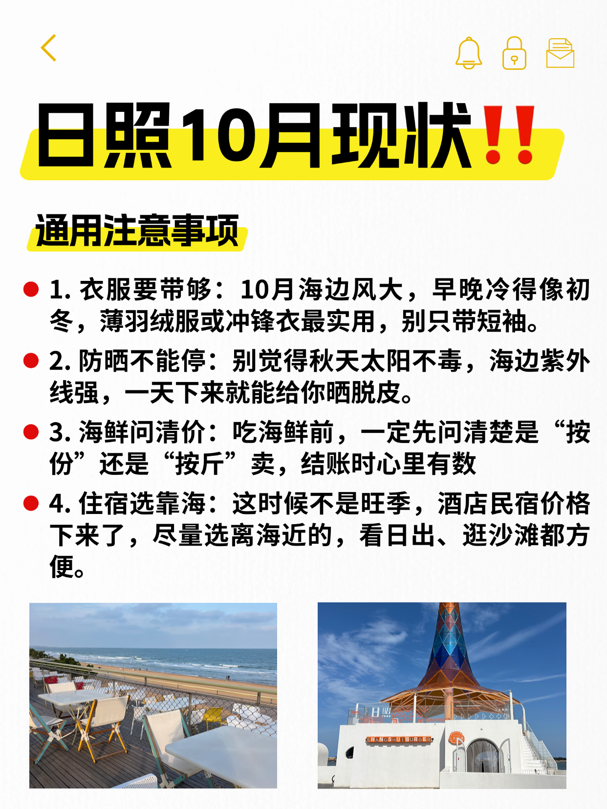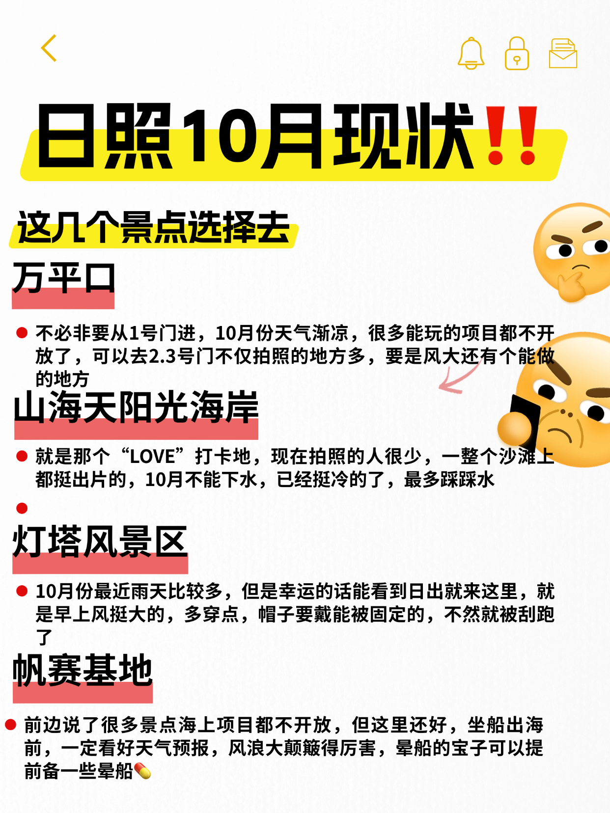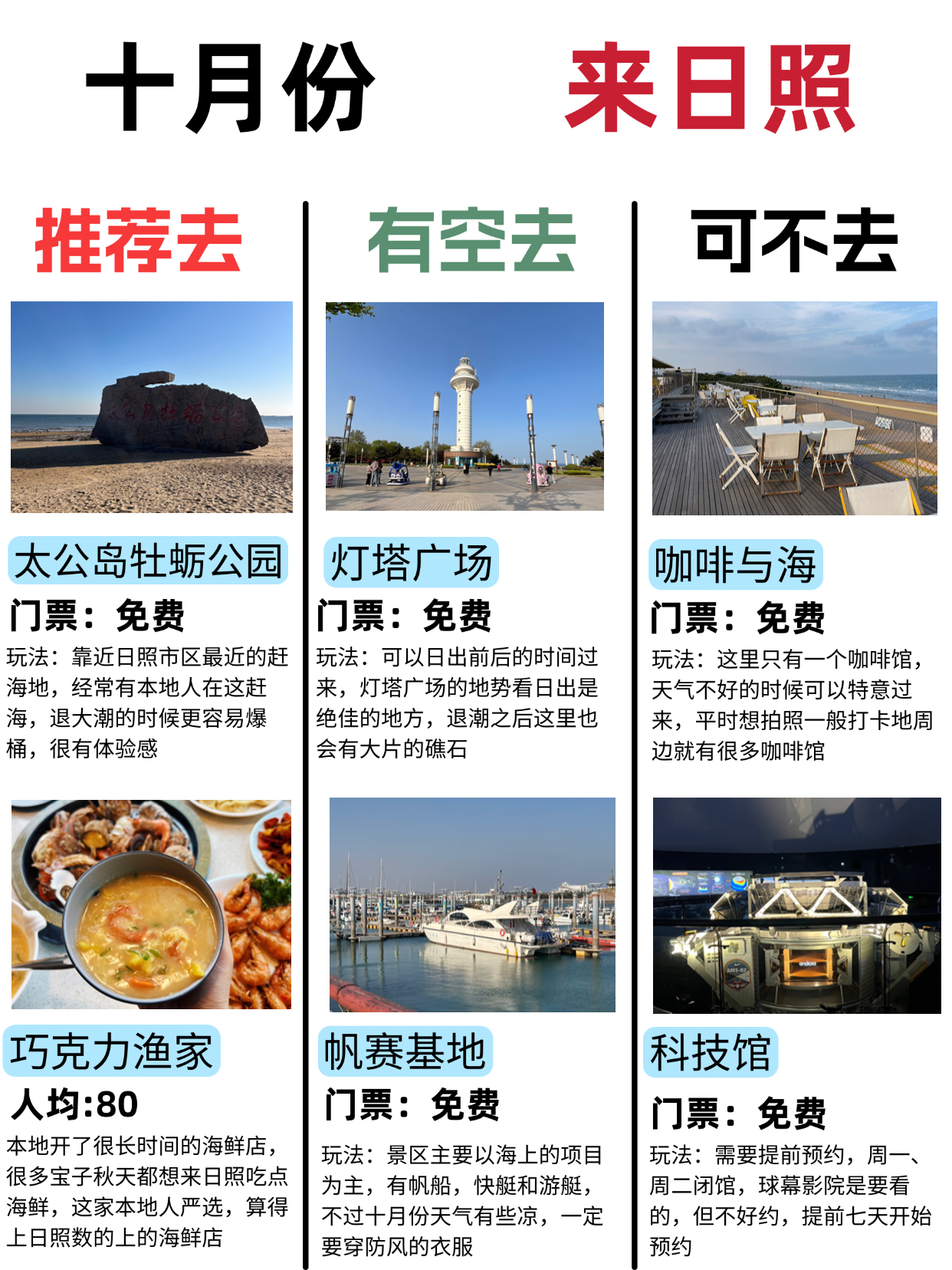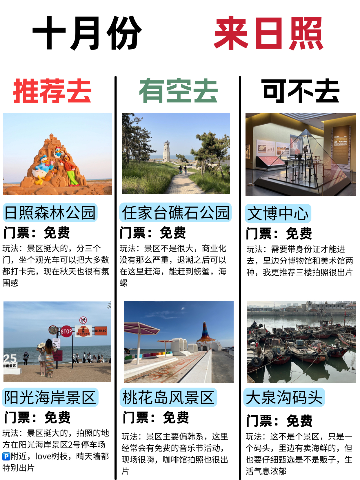 10月份过了假期来日照,有几句话要提醒你,如果没有提前做好安排,很有可能体验感大大降低,这份10月攻略请收好🧼万平口:不必非要从1号门进,10月份天气渐凉,很多能玩的项目都不开放了,可以去2.3号门不仅拍照的地方多,要是风大还有个能做的地方
