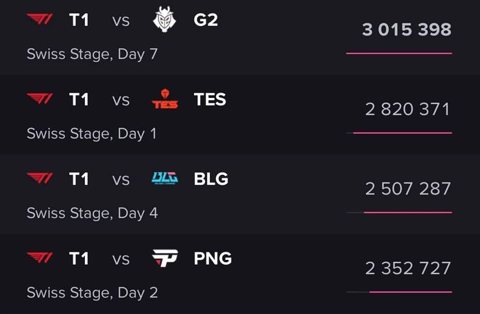 T1在瑞士轮阶段一共打了4场比赛,就占据了收视人数最高的前四名,只能说他们不愧是流量队。在T1对阵G2期间,欧洲主播Caedrel作为二路直播时,他的直播间人数也一度超过了27万人,这说明了看英雄联盟比赛的观众越来越多。这场比赛的收视峰值超越了2023全球总决赛的所有瑞士轮比赛,甚至超过T1对阵LNG的八强赛,相当于去年收视率第三名的比赛,仅次于决赛和半决赛。