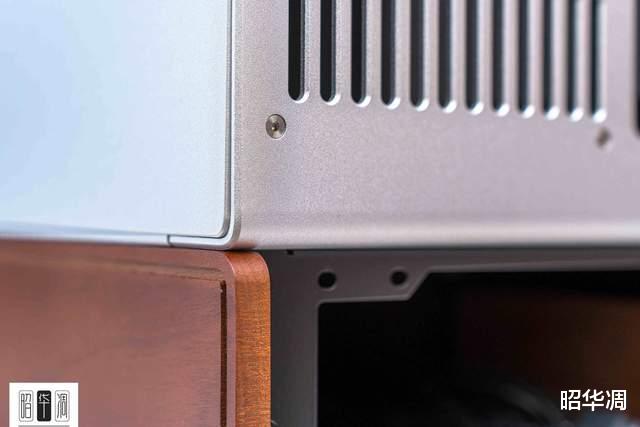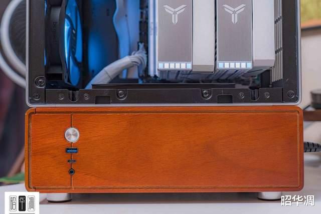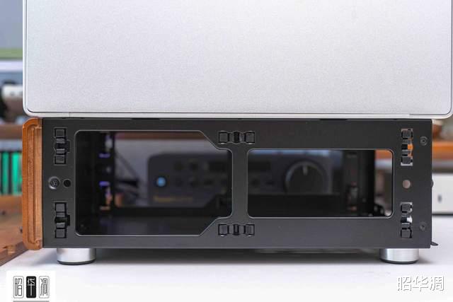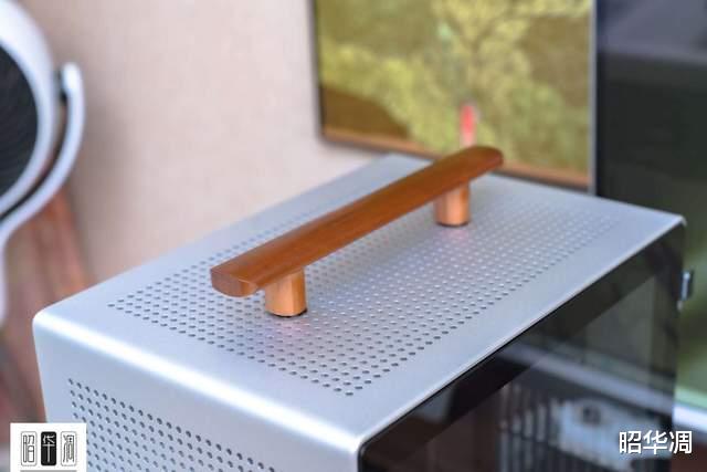▼机箱外壳是 3mm 厚铝合金与 10mm 北美胡桃木的惊艳结合,由 1mm 的钢板骨架支撑,上手就给人一种沉甸甸的信赖感。最妙的是上下分仓处那道圆润的线条,不仅在视觉上做了分割,更像是为冰冷的金属注入了木艺家具般的温度,完美诠释了什么叫“中式现代美学”。