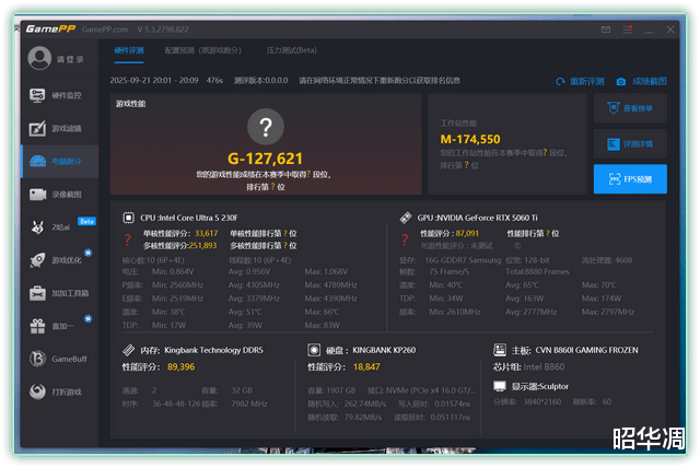 ▼游戏加加整机跑分:总分 127621、工作站性能 M-174550。CPU 单核性能评分 33617分、CPU多核性能评分 251893分、GPU性能评分 87091。