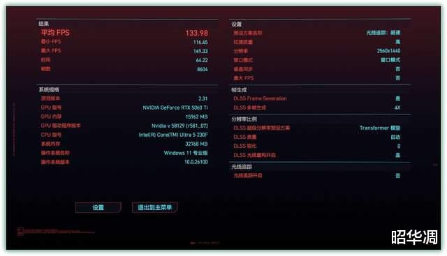 ▼赛博朋克 2077 在 2K 分辨率 + 预设光线追踪:超速 + 4X 帧生成,平均帧率达到 133.98FPS,最小帧率 116.45FPS。