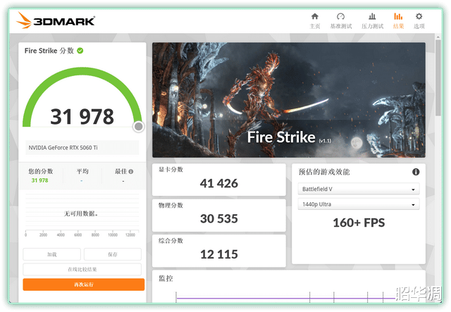 ▼3D Mark 性能测试,基于 DirectX 11 的 Fire Strike,实测下来整机总得分为 31978分,其中显卡分数 41426分,物理分数 30535分,综合得分 12115。