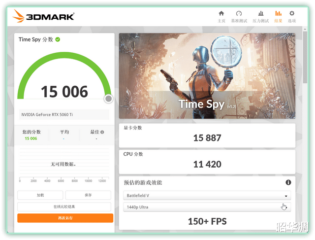 ▼基于 DirectX 12 的 Time Spy ,实测下来总得分为 15006分,其中显卡分数 15887分,CPU 分数 11420。