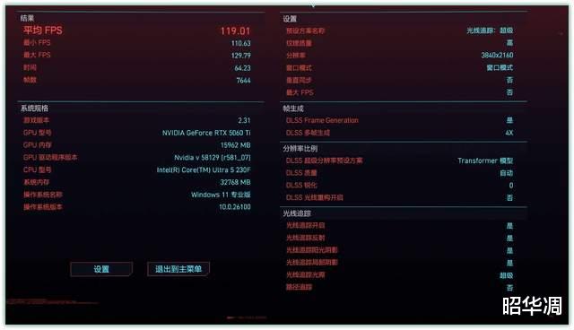 ▼切换到 4K 模式 + 光线追踪:超级同样能跑出 119帧。讲真,耕升 RTX5060TI 的实际游戏表现挺出乎我意料的,16GB 的显存跑 AI 也靠谱。