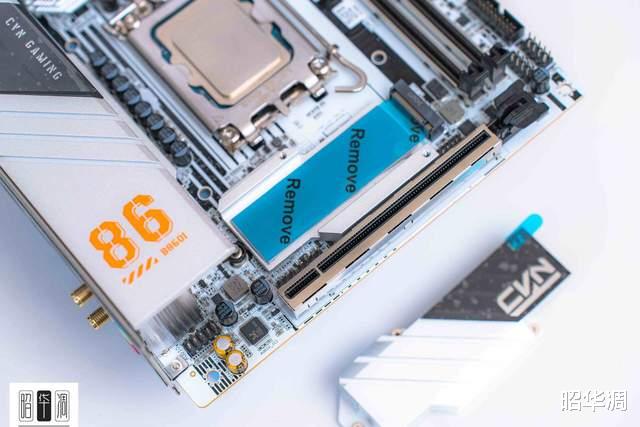 ▼主板采用银黑配色,大面积寒霜合金散热装甲,完整覆盖核心发热区域,装甲不仅厚实,表面还做了雾化处理,橙色的“86”字样标示了主板型号,细节做工相当精致,黑白撞色也能适合不同主机风格。