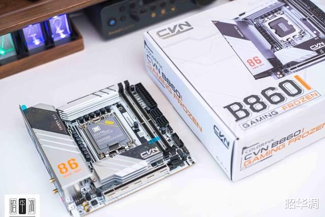 ▼主板是七彩虹 CVN B860I GAMING FROZEN V20 登陆舰, 8 + 1 + 1 + 1 相数字混合供电,配合 90A 高规格 DrMOS,搭配 I7 级别处理器也毫无问题,黑银配色风格也和机箱很搭。