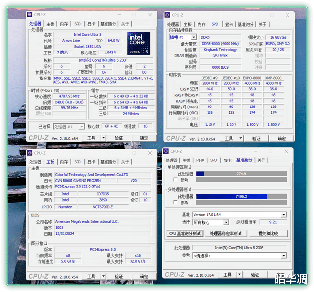 ▼CPU-Z 常规测试,Ultra5 230F 单核性能 752,多核性能 7270,比酷睿 i5-14490F 强