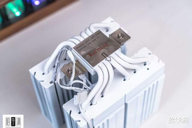 ▼散热器体型较大,纯白涂装覆盖了整个塔体和风扇,质感非常细腻,内部的 六 根 6mm 镀镍热管采用了逆重力结构,可以有效克服传统热管在某些角度下因重力影响导致的效率下降问题。