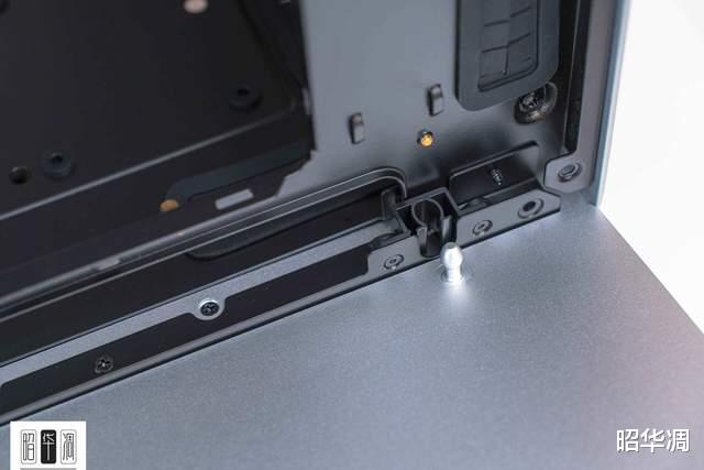 ▼机箱的快拆设计非常到位,所有侧板都是这种圆柱 + 卡扣的形式固定,无需螺丝刀就能将机箱彻底拆开。