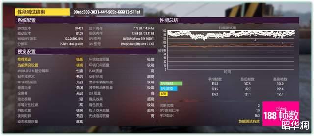 ▼地平线5 应该算是 Windows 平台优化最好的赛车游戏,画面表现也是相当不错,本次测试基于 2K 分辨率 + 极端特效,实测下来平均帧率达到了 188FPS。
