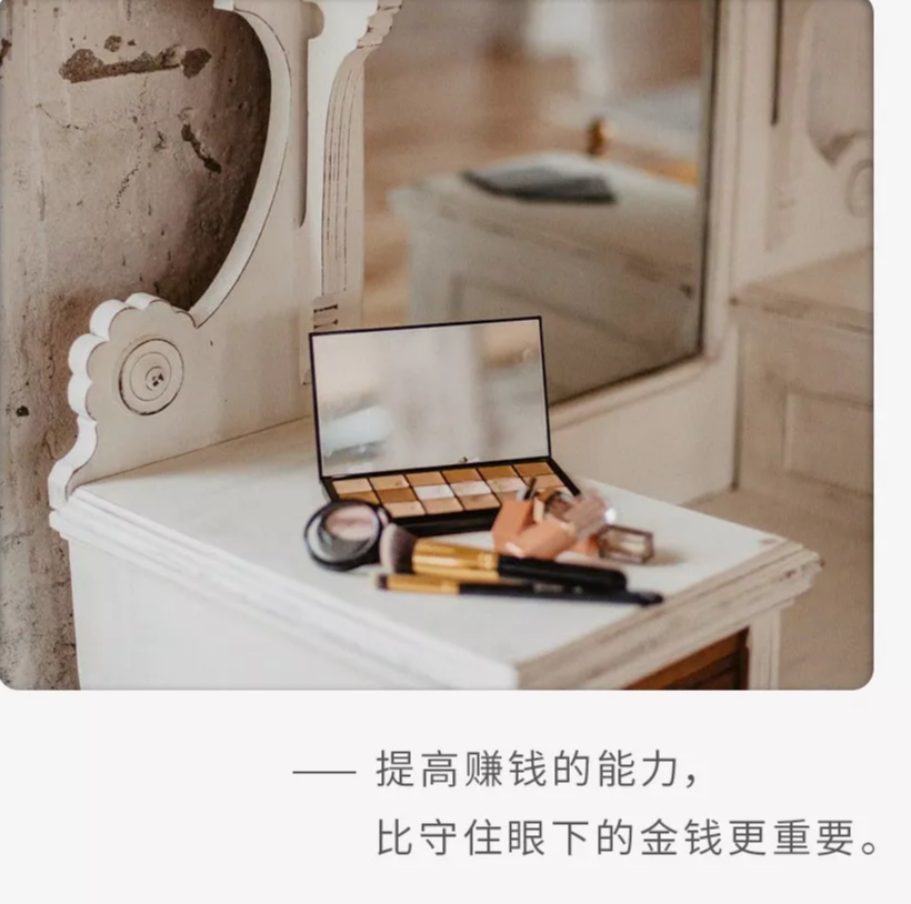 年轻的时候,不因短暂的稳定和安逸而满足,用金钱来丰富和武装自己才是更正确的消费方式,提高赚钱的能力要比守住眼下的金钱更重要。