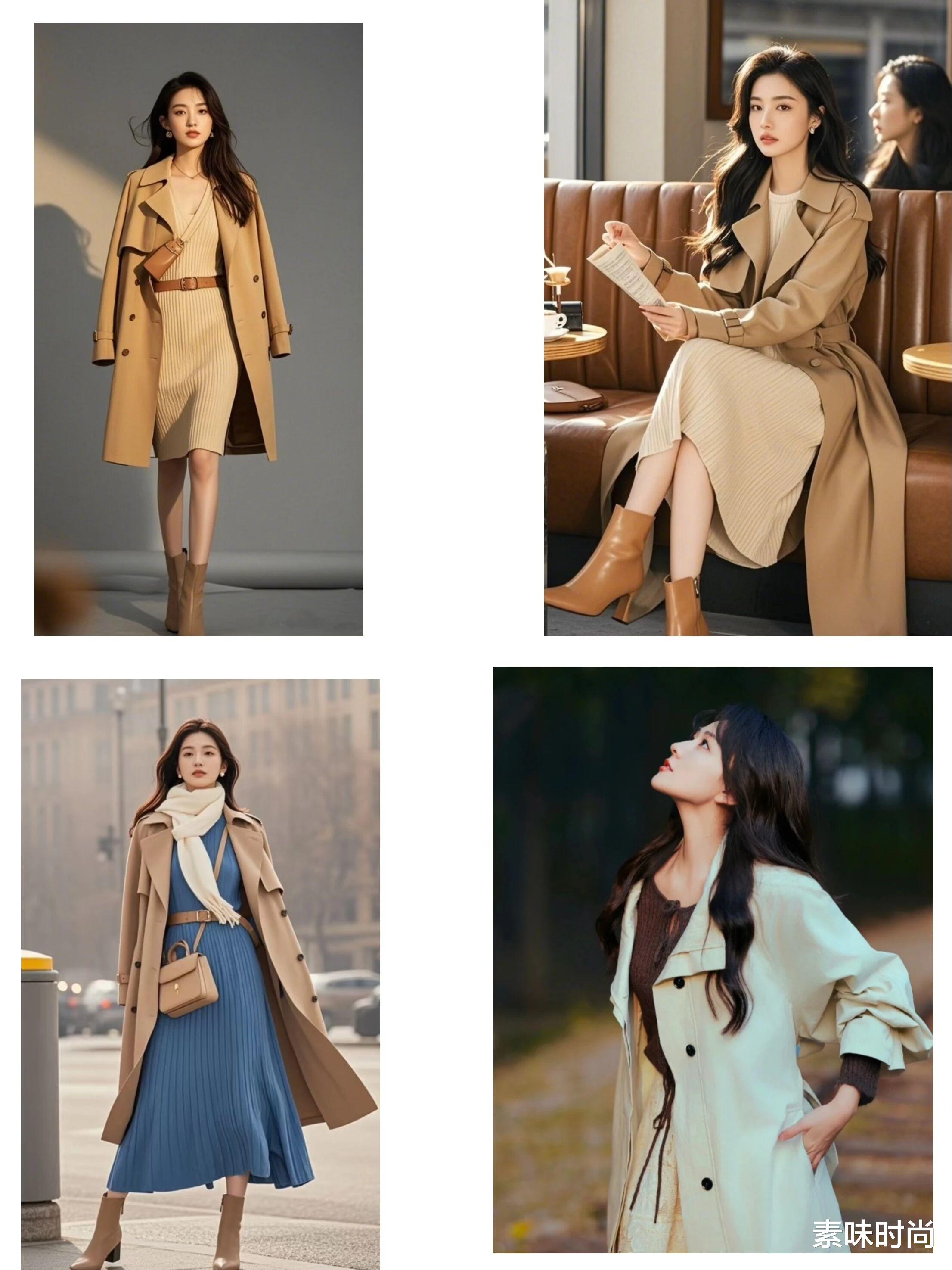 颜色组合:甜度适中——浅卡其风衣+浅粉色针织裙;法式浪漫——米白色风衣+淡紫色针织裙;温柔复古——焦糖色风衣+浅杏色针织裙。