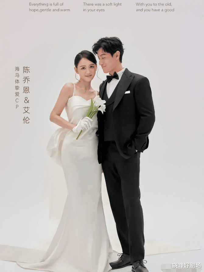 这组私服照中,小夫妻的自然甜蜜几乎要溢出屏幕。而在品牌婚纱照中,陈乔恩选择了两种极端的颜色。一袭纯白色婚纱裙,象征着他们纯洁无瑕的感情,搭配艾伦的纯黑色西装,宛如金童玉女。