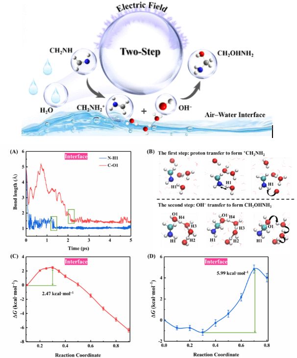 下图展示了使用AIMD来研究空气-水界面的非催化水解机理和动力学,通过键长以及自由能等形式来量化。