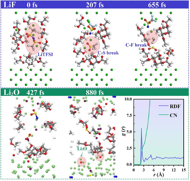 电荷转移与电荷局域化(理解电子如何在分子或材料中迁移或被俘获),下图展示了使用AIMD来研究电解液体系的断键的时间以及溶剂化结构。