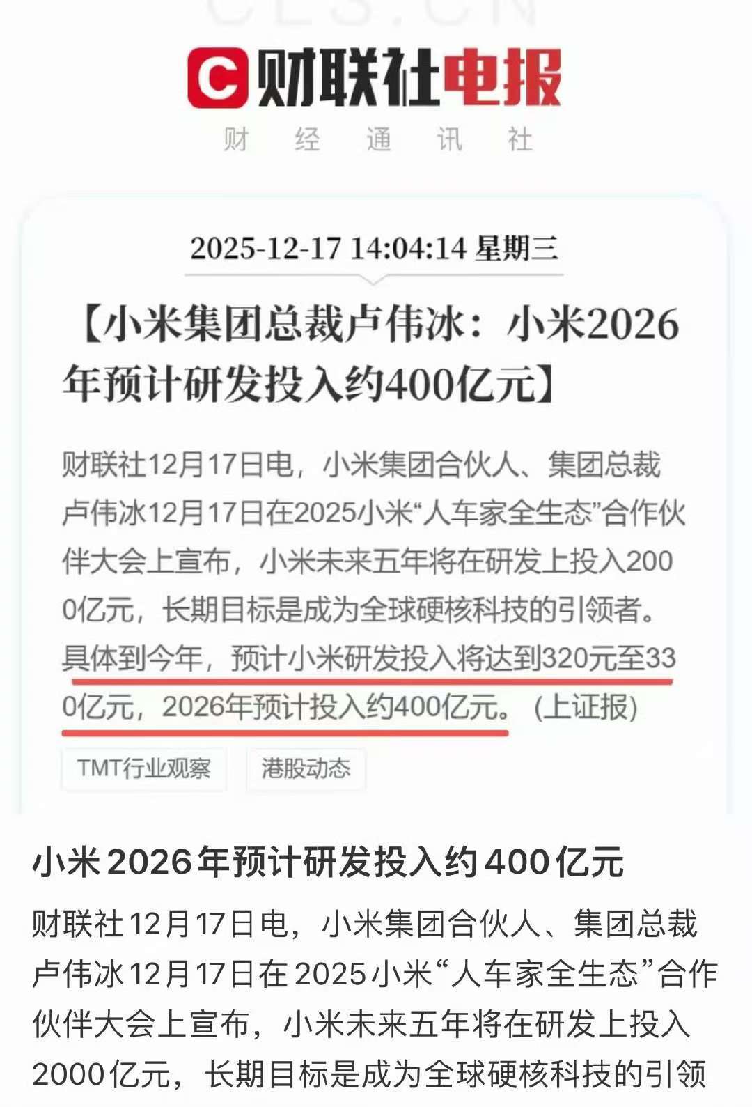 12月17日,财联社电报发布的一则关系小米未来投资预算的新闻。报道称,小米集团合伙人、小米总裁卢伟冰12月17日在2025小米“人车家全生态”合作伙伴大会上宣布,小米未来五年将在研发上投入2000亿元。这也就意味着,在2026年小米集团预计研发投入约400亿,结合之前网上曝光的小米架构调整、人事变动,以及之前卢伟冰在社交平台与网友的互动来看,未来5年小米极有可能会迎来更高质量的升级蜕变。