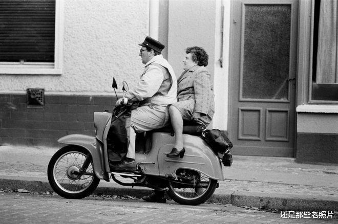 1986年,东德莱比锡骑摩托车的一对夫妇。